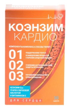 «Коэнзим Кардио» — комплекс, обладающий усиленным действием, который наряду с коэнзимом Q10 включает в себя липоевую кислоту и витамин Е. Тщательно подобранное сочетание этих веществ, необходимых для работы сердечно-сосудистой системы, способствует устранению их дефицита в организме человека.