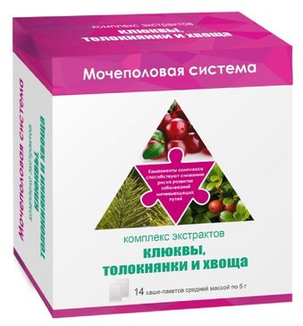 Инструкция: Комплекс содержит витамин С и растительные экстракты ягод клюквы, травы хвоща, листьев брусники и толокнянки. Эти растения используются в народной медицине при воспалениях мочевыводящих путей и дискомфортном диурезе. Прием комплекса осуществляется в виде раствора, что увеличивает объем выпиваемой жидкости и способствует усилению диуреза — для более активного выведения из мочевого пузыря вредных веществ и микроорганизмов. Клюква (экстракт плодов) • Защищает стенки мочевого пузыря от воздействия бактерий. • Способствует предупреждению повторного развития дискомфорта мочеполовой системы. • Оказывает антиоксидантное действие, помогая уменьшить негативные последствия воспалительных процессов. Хвощ полевой (экстракт травы) • Положительно влияет на функциональное состояние мочевого пузыря и мочевыводящих путей. • Обладает противовоспалительными свойствами. • Ускоряет диурез, благодаря чему бактерии не успевают прикрепиться к стенкам мочевого пузыря. Толокнянка (экстракт листьев) Русское народное название — «медвежьи ушки» или «медвежий виноград». Традиционно применяется при дискомфортных состояниях, связанных с диурезом. • Ускоряет выведение мочи из организма, не позволяя ей застаиваться, что способствует созданию неблагоприятных условий для развития микроорганизмов. • Обладая вяжущими свойствами, уменьшает раздражение клеток эпителия мочевого пузыря и дискомфортные ощущения. • Связывает вредные белки, выделяемые бактериями в процессе жизнедеятельности. Брусника (экстракт листьев) • Обладает мягкими диуретическими и дезинфицирующими свойствами, способствуя удалению из мочевого пузыря вредных веществ и микроорганизмов. • Укрепляет капилляры, которые нередко повреждаются при заболеваниях мочевыводящих путей. Витамин С • Улучшает функциональное состояние мочеполовых путей. • Способствует созданию в мочевом пузыре кислой среды, неблагоприятной для развития микроорганизмов. • Являясь антиоксидантом, уменьшает количество свободных радикалов, избыток которых сопровождает любые воспалительные процессы и негативно сказывается на состоянии эпителия мочевого пузыря.