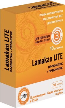 Показания к применению: Рекомендуется в качестве биологически активной добавки к пище - в качестве источника пробиотических микроорганизмов (бифидобактерии, лактобактерии). С учетом свойств LAMAKAN LITE рекомендован: • Для нормализации кишечной микрофлоры в период антибактериальной терапии; • Для восстановления и нормализации микрофлоры кишечника, в том числе, при погрешностях в питании, при смене климата, потребляемой воды и диеты; • Для улучшения функционального состояния кишечника; • В качестве вспомогательного средства при функциональных расстройствах кишечника, диарее (поносе), нарушении пищеварения, запоре, метеоризме (вздутии живота), тошноте, отрыжке, рвоте, боли и дискомфорте в животе и пр.; • Для уменьшения образования вредных веществ в кишечнике, таких как аммиак, индол и сероводород.