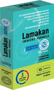 Показания к применению: Рекомендуется в качестве БАД к пище - в качестве источника пробиотических микроорганизмов (бифидобактерии, лактобактерии). С учетом свойств LAMAKAN IMMUNE FORMULA рекомендован: • Для повышения защитной функции имунной системы и общей резистентности организма, особенно в период сезонных всплесков инфекционных заболеваний; • Для нормализации кишечной микрофлоры в период антибактериальной терапии; • Для восстановления и нормализации микрофлоры кишечника, в том числе, при погрешностях в питании, при смене климата, потребляемой воды и диеты; • Для улучшения функционального состояния кишечника; • В качестве вспомогательного средства при функциональных расстройствах кишечника, диарее (поносе), нарушении пищеварения, запоре, метеоризме (вздутии живота), тошноте, отрыжке, рвоте, боли и дискомфорте в животе и пр.; • Для уменьшения образования вредных веществ в кишечнике, таких как аммиак, индол и сероводород.